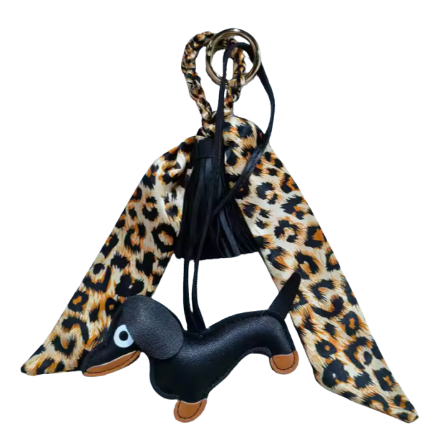 Luxe Teckel Bagcharm met sjaaltje in panterprint en kwast. Stijlvolle accessoire voor jouw tas of hondenriem
